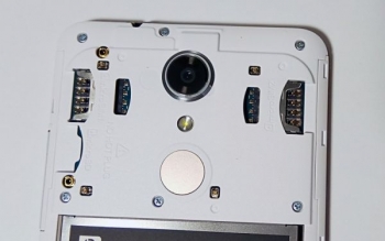 Тыльная часть корпуса отдана под основную камеру со вспышкой, сканер отпечатков пальцев и решетку внешнего динамика; под ней видим несъемный аккумулятор больших размеров, два слота под SIM-карты и отдельный слот под microSD. Горячая замена в данной модели не предусмотрена.