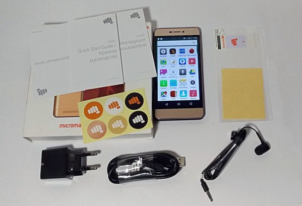 В дополнение к перечисленным аксессуарам смартфон получил фирменные наклейки Micromax, гарантийный талон, две инструкции (краткую и полноценную), дата-кабель microUSB и сетевое зарядное устройство на 2 ампера, что уже сулит быструю зарядку.