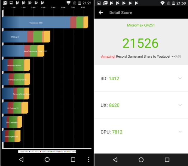 AnTuTu поставил Micromax Canvas Juice A1 21526 баллов, а Quadrant Standard – 8485 баллов. В многоядерном режиме в GeekBench результат составил 953 балла, а в одноядерном – 384 балла.