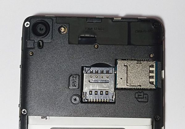 Передняя панель Micromax Canvas Juice A1 быстро покрывается отпечатками, но легко очищается практически любой тканью, а металлический задник практически не пачкается. Под крышкой смартфона находится несъемный аккумулятор, на котором отсутствует информация о его емкости, а чуть выше можно увидеть камеру, вспышку и три раздельных слота – microSD и два SIM.