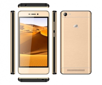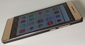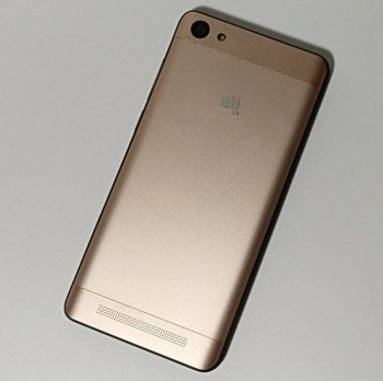 Micromax Canvas Juice A1 выполнен в стандартном форм-факторе, то есть это сенсорный моноблок без аппаратной клавиатуры. В золотой цвет корпуса здесь окрашены и лицевая, и тыльная панель, что значительно украшает экстерьер, а торцы имеют черный окрас и сделаны из специального пластика, устойчивого к царапинам и имеющего определенную текстуру. Это своего рода нативный защитный бампер, и в сочетании с золотым оттенком такое решение смотрится очень гармонично.