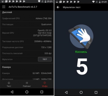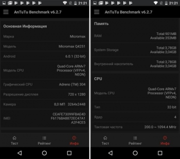 AnTuTu поставил Micromax Canvas Juice A1 21526 баллов, а Quadrant Standard – 8485 баллов. В многоядерном режиме в GeekBench результат составил 953 балла, а в одноядерном – 384 балла.