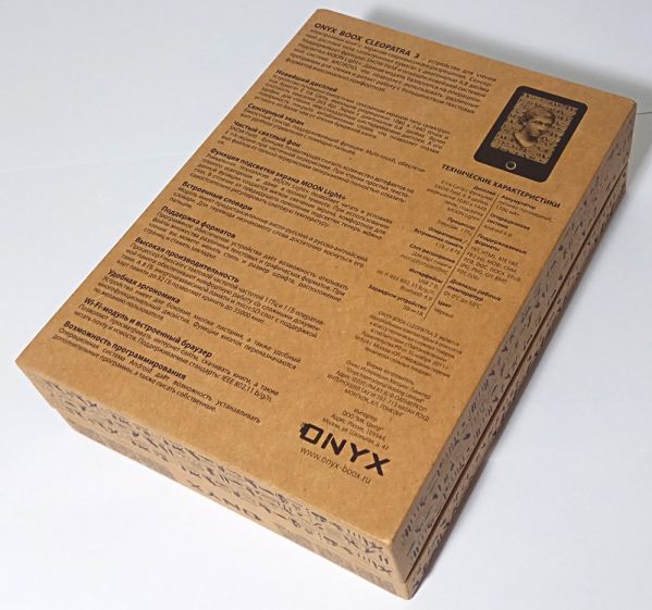 Снизу на коробке есть перечень характеристик самого ридера и краткий список его основных достоинств, часть из которых мы уже перечислили. Также имеется небольших размеров рендер устройства, толком не дающий представление о его дизайне, а сверху есть тисненое позолотой изображение самой царицы Клеопатры.