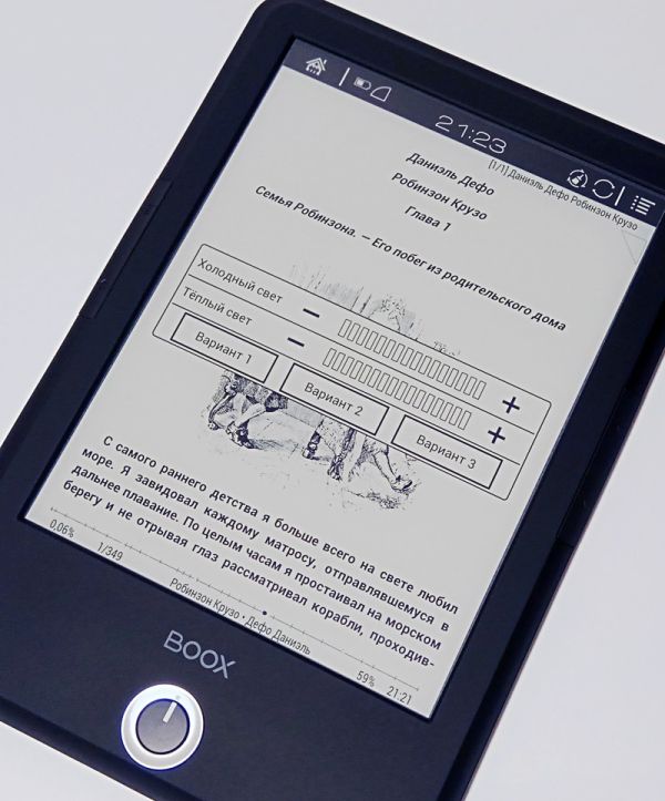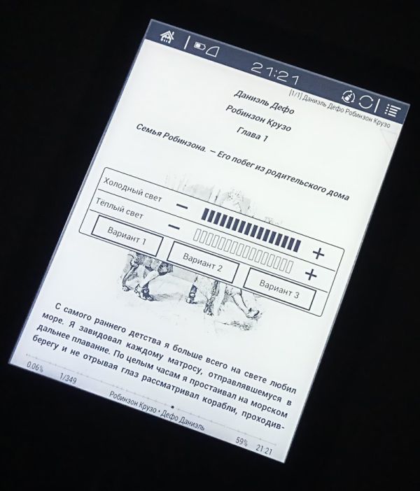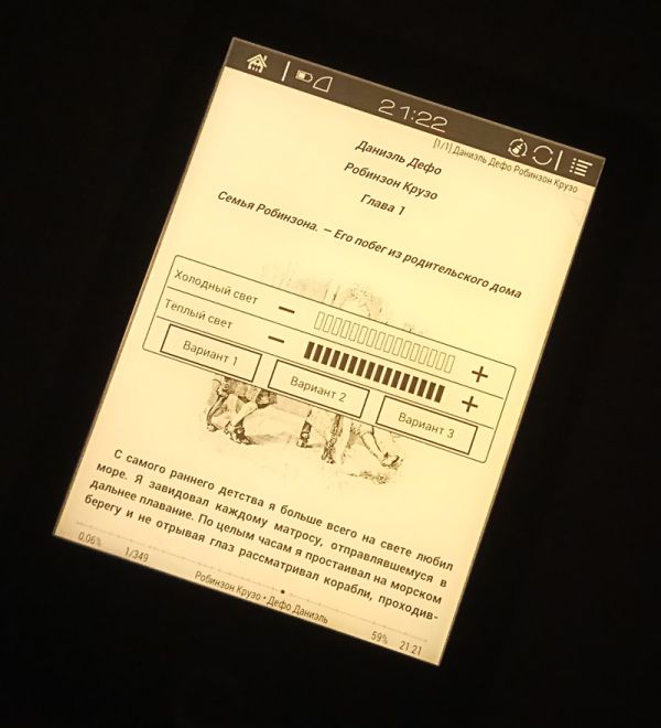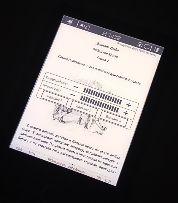 Оттенки подсветки выглядят очень приятно, но до максимума выкручивать не стоит: для комфортного чтения здесь хватает 50-60 процентов, а все остальное уже излишне. На фотографиях приведены примеры максимальной яркости теплого и холодного оттенков. Сама яркость настраивается плавно, по тому же принципу что и в смартфонах на Android.