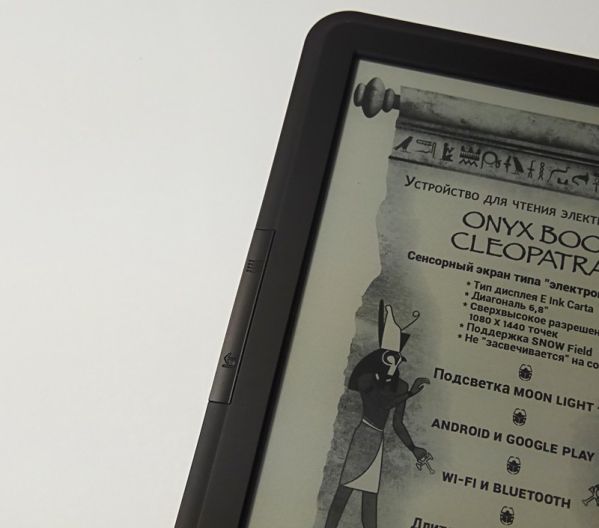 От традиционных ридеров третье поколение «Клеопатры» отличается в первую очередь размером экрана: 6,8 дюйма против стандартных 6 дюймов. Разница, с одной стороны, невелика, и само устройство еще вполне можно назвать компактным, но эти 0,8 дюйма позволяют уместить больше информации на одном экране и тем самым уменьшить количество его обновлений, что положительно сказывается на времени автономной работы.