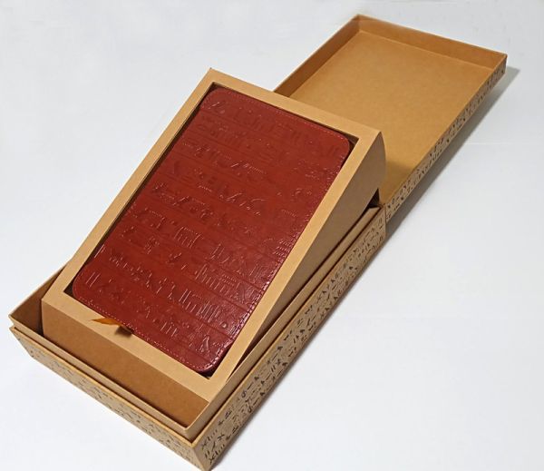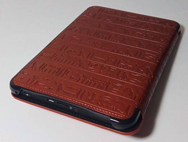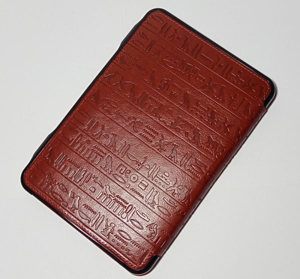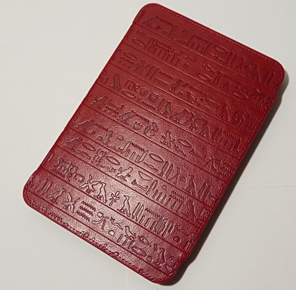 Onyx Boox Cleopatra 3 поставляется в чехле-обложке, сверху и снизу отделанном искусственной кожей темно-красного цвета. Присутствуют тиснения в виде все тех же древнеегипетских иероглифов, придающие дополнительную изящность аксессуару, а внутри у него идет отделка черной бархатистой тканью.