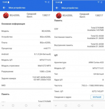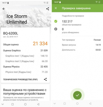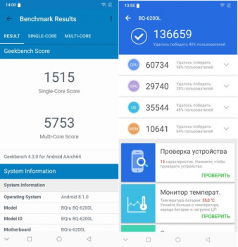 AnTuTu поставил смартфону 136659 баллов, GeekBench – 1515 и 5753 балла в одноядерном и многоядерном режимах, а игровой тест 3DMark с пакетом Ice Storm выдал 21334 балла. Для смартфона за 16000 рублей показатели не просто отличные, они недостижимы для 90% конкурентов за те же деньги. В процессе тестирования BQ Aurora практически не грелся.