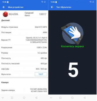 Сенсорный слой обрабатывает пять касаний одновременно – оптимальное значение для современного смартфона, больше от него не требуется. Тач одинаково хорошо работает по всей площади экрана, фантомные срабатывания от ладоней замечены не были.