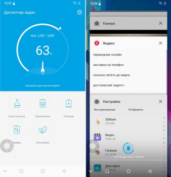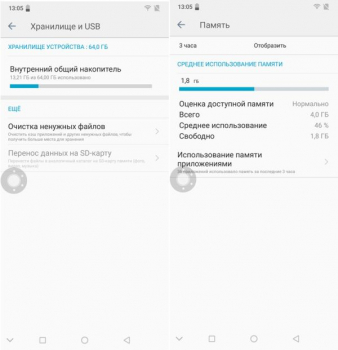После первой загрузки в смартфоне занято 1,8 Гб RAM из 4 Гб и 13,2 Гб ROM из 64 Гб. Удаление предустановленного софта освобождает немало места в ROM, равно как и отключение ненужных приложений очищает ОЗУ.