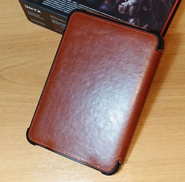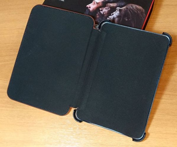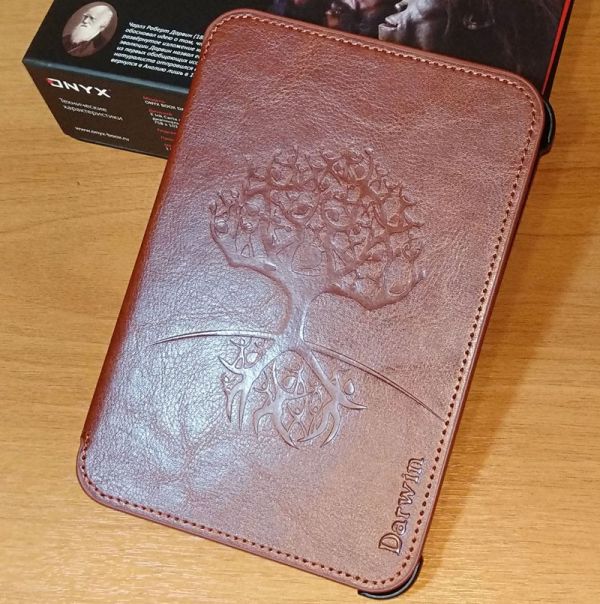 Чехол изготовлен из очень качественных материалов: сверху и сзади это эко-кожа с тиснением в виде древа эволюции, а внутри это своего рода черный бархат. На ощупь это мягкий материал, не способный повредить корпус книги. Ридер размещается в пластиковом держателе с четырьмя «ушками», захватывающими углы его корпуса. Крепление надежное – книга не выпадает и фиксируется очень прочно. Сам чехол прошит по периметру, что в значительной мере повышает его эксплуатационные свойства и увеличивает время использования.