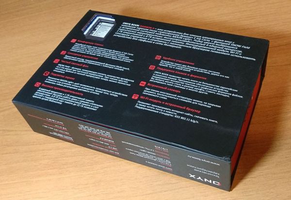 Увы, рендера книги сверху на коробке нет, он есть лишь снизу, но настолько крошечный, что оценить ее дизайн по нему не представляется возможным. Основная площадь нижней грани коробки отдана под описание возможностей ридера, а подробный перечень его характеристик вынесен на один из боковых торцов.