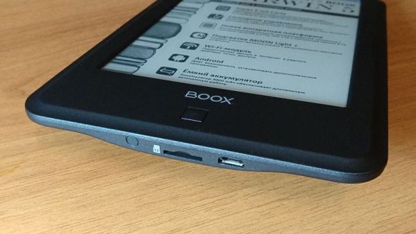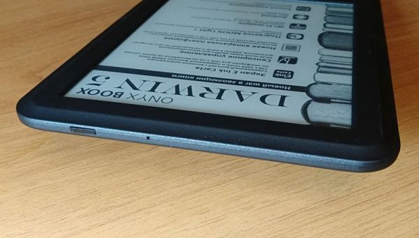 Расположение интерфейса зарядки внизу корпуса позволяет читать книгу даже во время подзарядки – кабель мешать точно не будет. Корпус хоть и выглядит сильно шероховатым, на деле имеет достаточно гладкую поверхность. Тем не менее, из рук он не выскальзывает.