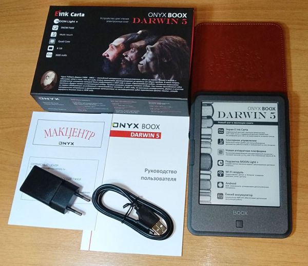 Вместе с макулатурой комплект Darwin 5 состоит из зарядного устройства на 1 ампер, дата-кабеля с коннектором microUSB 2.0 и фирменный кожаный чехол благородного светло-коричневого оттенка. Подавляющее большинство книг поставляется без него, и приходится либо жертвовать корпусом, который без должной защиты неизбежно покроется царапинами, и экраном, либо покупать чехол отдельно.