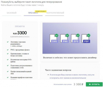 — тарифный план «Премиум»: логотипы с разрешением 4096×4096 пикселей в форматах PNG, JPG и векторном SVG. Помимо этого, пакет включает в себя оригинальные, темные и белые логотипы, адаптацию в социальных сетях, профессиональный водяной знак, а также данные по шрифтам и цветовой палитре, рекомендации по бренду, полностью готовые к печати образцы и возможность внесения изменения и нового скачивания. Столь обширный набор опций оценивается в 3300 руб.