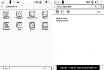 Оболочка ридера сделана с упором на чтение, и потому пользователя сразу встречают экран с последними открытыми книгами и удобная библиотека. Меню настроек позволяет очень тонко кастомизировать книгу, в том числе и переназначить боковые кнопки, а в список приложений входят браузер, калькулятор, часы, клиент электронной почты и словарь. Последний совмещает в себе не только, собственно, словарь, но и переводчик – если встретите в книге незнакомое слово на иностранном языке, вы сможете быстро узнать его перевод.