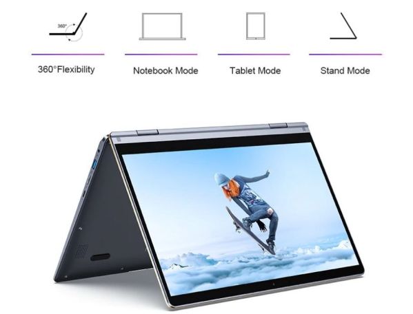 Цена XIDU PhilBook Max в интернет-магазине AliExpress составляет $395 с учетом очень неплохой скидки в размере 38% — изначальная цена данного ПК составляет ровно $600. Также по этой ссылке вас ждет дополнительный купон на скидку. Рассмотрим сперва экран этого трансформера. Его диагональ составляет 14,1 дюйма, но за счет тонких рамок толщиной всего 5 мм общие габариты ноутбука совпадают с моделями на 13,3 дюйма. Это улучшает его мобильность и повышает удобство использования за пределами дома или офисного помещения. Разрешение экрана составляет 1920х1080 пикселей при соотношении сторон 16:10, а над экраном находится веб-камера для Скайпа и других современных мессенджеров (сейчас даже ICQ, о которой все давно забыли, поддерживает видеозвонки). Дисплей находится на мощных шарнирах, способных вращаться на 360 градусов, и поддерживает 10 одновременных прикосновений, так что можно управлять всеми пальцами обеих рук, если потребуется. Корпус ноутбука выполнен из алюминия и весит со всей начинкой, включая аккумулятор на 5 часов автономной работы, всего 1,4 килограмма. При этом его толщина в закрытом состоянии составляет всего 16 миллиметров, и это очень неплохо по меркам 2019 года.