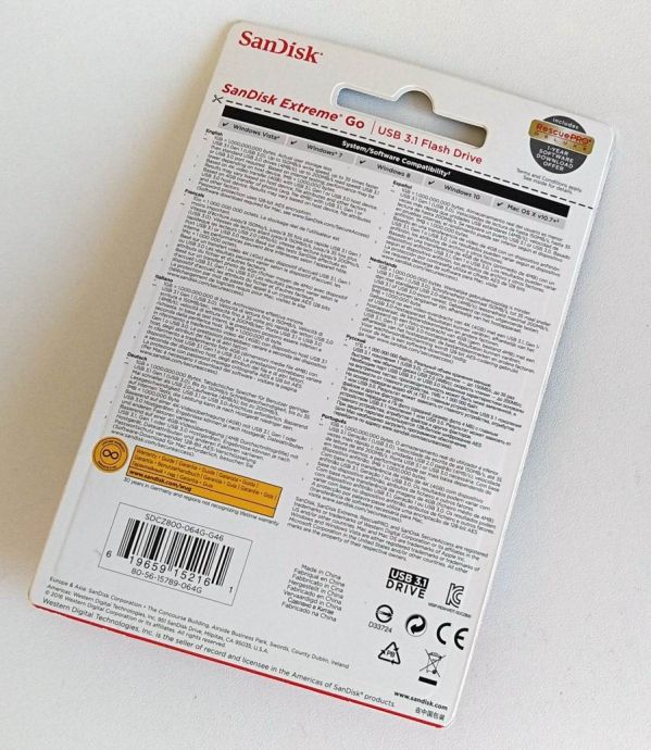 SanDisk Extreme Go поставляется в картонном «блистере с прозрачной пластиковой вставкой, чтобы при покупке видеть, так сказать, товар лицом. Спереди все на английском, но понять, что именно, написано, можно без углубленных знаний языка. Первое, что бросается в глаза – это показатели скорости, которые выдает накопитель. Здесь же указано, что он оснащен современным интерфейсом USB 3.1 – такой есть далеко не в каждом компьютере или ноутбуке, но об этом позже.