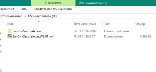 После подключения к ноутбуку на Windows из заявленных 64 ГБ пользователю будет доступно 58,2 ГБ. В памяти по умолчанию находятся дистрибутивы фирменного ПО SanDisk SecureAccess, которое рассмотрим отдельно.