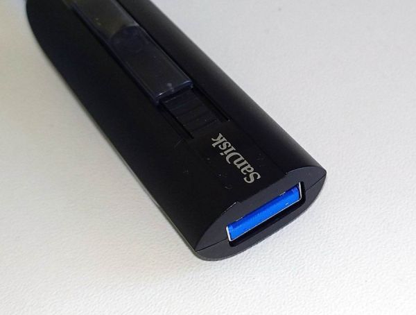Пластик SanDisk Extreme Go на вид очень прочный, при сдавливании не прогибается. Накопитель производит впечатление монолитного, и вопросы вызывает лишь упомянутый ползунок – пальцы все время скользят по нему. Ему явно не хватает насечек или любой другой текстуры. С другой стороны, механизм подпружинен – достаточно лишь слегка толкнуть ползунок в нужную сторону, и коннектор появится из корпуса или скроется внутри него, так что все некритично.