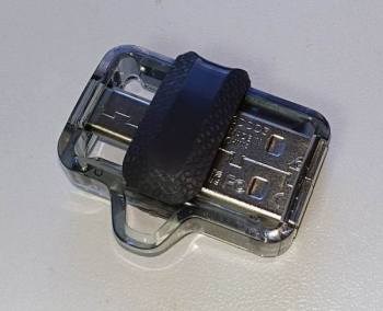 Подвижная часть корпуса выполнена из непрозрачного пластика с текстурой для удобства хвата. В крайних положениях (когда выдвинут один из двух коннекторов), она фиксируется относительно надежно, но при подключении к ПК или мобильному устройству рекомендуем придерживать центральную часть пальцами.
