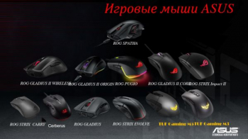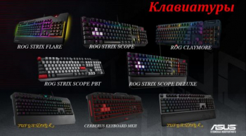 Среди блоков питания выделяют ROG Thor (1200 Вт и 850 Вт) и ROG Strix (750 Вт и 650 Вт). Последние обладают сменными панелями для кастомизации. Из всего многообразия клавиатур ROG, STRIX и TUF следует выделить оптико-механического представителя TUF Gaming K7, которая обладает скоростью срабатывания 0,2 мс, а стоит меньше, чем клавиатуры с механическими переключателями. Среди мышек так же присутствует похожее разделение по категорям: ROG, STRIX и TUF.