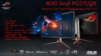 Яркий представитель — 27-дюймовый монитор ROG Swift PG27UQX на квантовых точках с частотой 144 Гц. Устройство имеет 576 зон затемнения и пиковую яркость 1000 кд на кв. м. Вторая новинка ROG STRIX XG17 – первый в мире 240 Гц портативный игровой монитор. Он обладает дисплеем с диагональю 17.3 дюйма, временем отклика 3 мс и аккумулятором, заряда которого хватит на 3 часа работы.