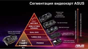 У линейки ROG STRIX GAMING тоже три вентилятора, но уже без жидкостного охлаждения. Как не трудно догадаться платы линейки DUAL/EVO имеют только пару кулеров, не столь навороченные по функциям, но и стоят весьма приемлемо. Видеоконтроллеры TURBO/EVO имеют всего один вентилятор. Платы TUF GAMING/TUF GAMING X3 обладают миллиарии дизайном и оборудованы двумя или тремя кулерами. Видеокарты PHONIX имеют один вентилятор и максимально компактные размеры.