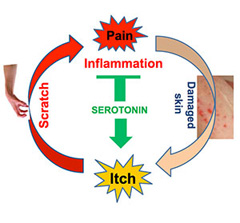 Ученым давно известно, что расчесывание зудящей кожи вызывает слабые болевые ощущения. «Мозг получает эти сигналы, и реагирует на них, выделяя нейромедиатор серотонин, помогающий справиться с болью. Однако это вещество, попадая в спинной мозг, нередко «сходит с рельсов» и вместо нейронов боли вступает в реакцию с нервными клетками, усиливающими ощущение зуда», — объясняет ведущий автор исследования Чжоу-Фэн Чэнь (Zhou-Feng Cheng).