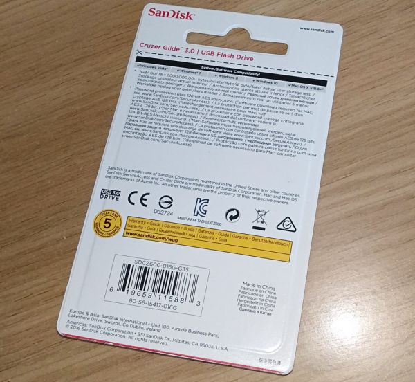 В сравнении с большинством других USB-накопителей упаковка SanDisk Cruzer Glide 3.0 очень небольшая, а это значит, на нее расходуется меньше картона, что положительно сказывается на уменьшении вреда, наносимого окружающей среде за счет вырубки лесов. В то же время на ней есть все необходимые пользователю сведения, и даже больше.