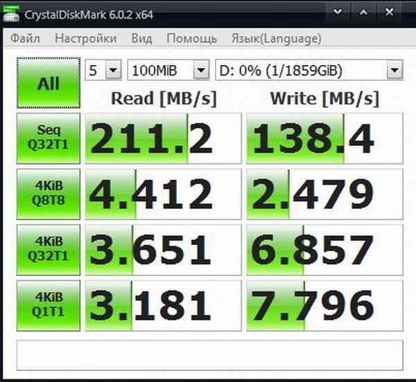С USB 2.0 все было понятно сразу, еще до подключения – винчестер, рассчитанный под более современный стандарт, будет работать на максимальной для этого интерфейса скорости. Так и вышло: на чтение он выдал 32 Мб/с, а на запись – 25 Мб/с. Как видно, это ниже заявленных 140 Мб/с, но на большее не способен уже сам USB 2.0.