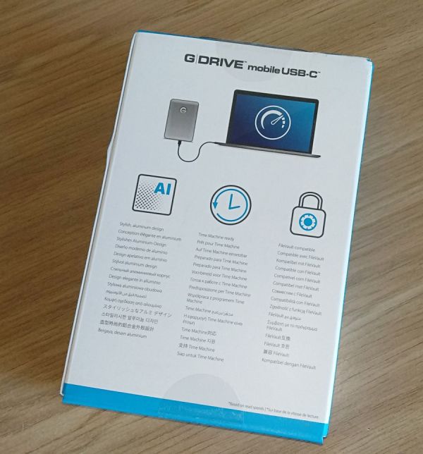 Даже если вы ничего не знаете про G-Technology G-Drive mobile USB-C, то ради сведений о нем не нужно идти в интернет. Коробка, в которой он поставляется, информативна на 110 процентов. Выполненная из прочных материалов и красиво оформленная, она сразу покажет, как выглядит находящийся в ее недрах гаджет и расскажет о его основных спецификациях.