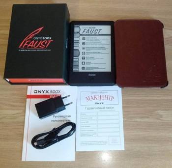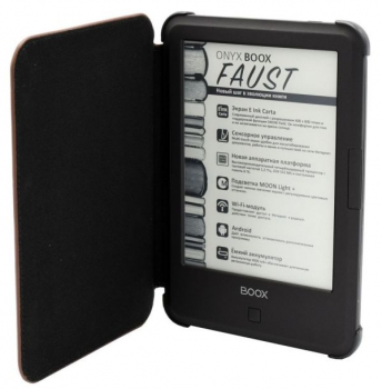 Onyx Boox Faust поставляется с кейсом-обложкой, в закрытом состоянии, в отличие от обычных бамперов, защищающим не только тыльную поверхность корпуса, но еще и экран. Чехол относится к разряду смарт-аксессуаров, умеющих взаимодействовать с самим устройством: в данном случае это проявляется в умении переводить книгу в спящий режим для экономии энергии при закрытии крышки. Реализовано это за счет вшитых в обложку магнитов, которые активируют расположенный внутри книги датчик Холла. При открытии чехла устройство пробуждается автоматически.