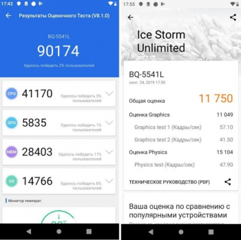 Результаты, на самом деле, нас сильно удивили. Смартфон получил очень высокие результаты в обоих тестах – AnTuTu поставил ему 90174 балла, а 3DMark выдал 11750 баллов. Для подавляющего большинства современных игр этого хватит с лихвой, не говоря уже о 99% всех обычных приложений. Во время теста ощущался незначительный нагрев корпуса в районе центрального процессора.