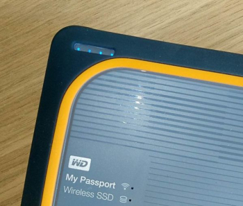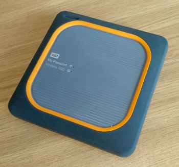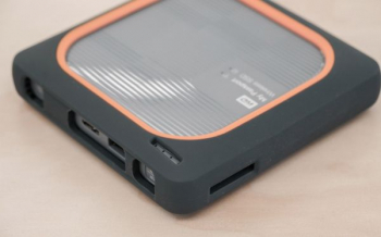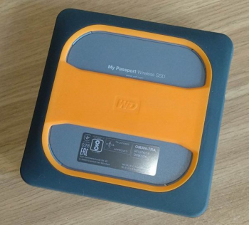 My Passport Wireless SSD окрашен в серый цвет, как и его защитная одежка, плюс есть ярко-оранжевые акценты. Корпус на торцах и снизу матовый, а сверху есть большая глянцевая вставка.