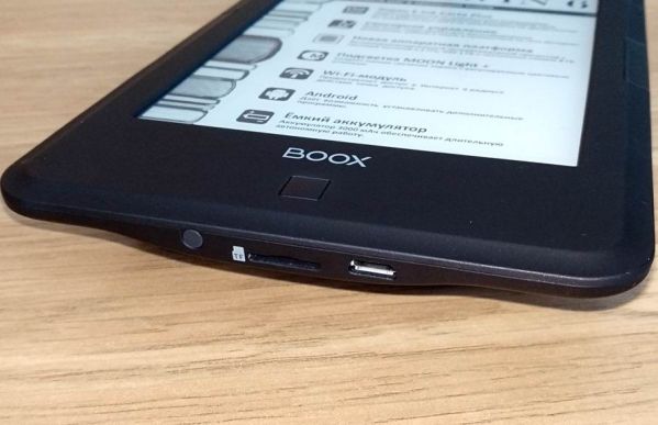 Теперь по элементам корпуса – их тут не очень много, но они есть. лицевая панель отдана под дисплей с широкими рамками, под которым находится кнопка Home, как в Android. нижний торец отдан под разъемы microSD и microUSB, а по бокам есть лишь кнопки листания. Сзади на корпусе книжки нет ничего, кроме технической информации.