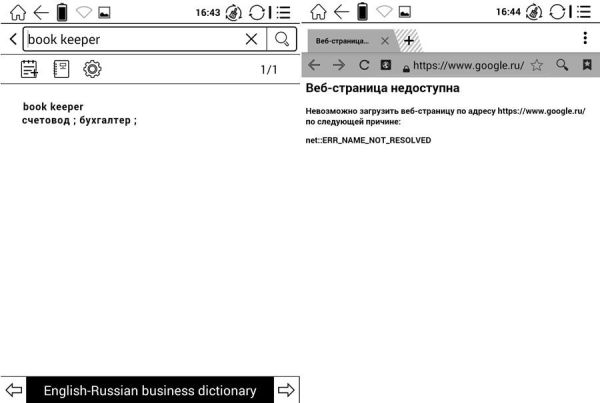 В наличии раздел «Библиотека», в котором удобно рассортированы все имеющиеся в памяти устройства книги. Они отображаются с обложками (при их наличии), и их можно очень удобно рассортировывать. По умолчанию в прошивке Darwin 6 есть лишь несколько базовых приложений – браузер, о котором мы поговорили выше, часы, калькулятор, клиент электронной почты и словарь с функциями переводчика. Последний, на наш взгляд, самый полезный из набора – в нем можно узнать не только перевод, но и значение нового слова, обнаруженного в процессе чтения, причем переключиться на словарь можно прямо из программы для чтения, коих здесь, стати, две.