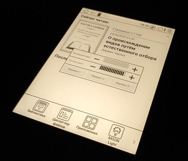 Что касается яркости подсветки, то в Darwin 6 она, традиционно для книг Onyx Boox, избыточна, в хорошем смысле этого слова. Комфортное чтение в нашем случае было достигнуто при 35% яркости, что положительно скажется на времени работы устройства от аккумулятора. И еще один важный момент – экран на электронных чернилах никогда не выцветает на солнце, в отличие от жидкокристаллических дисплеев, так что, если любите читать на улице, то подсветку можно вообще не включать. На улице при ярком свете смысла в подсветке нет. Она нужна только при недостаточном освещении.