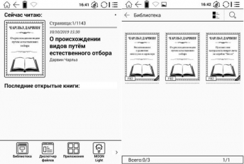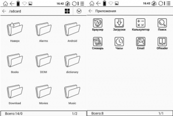 Оптимизированная Android 4.4 KitKat дополнена фирменным интерфейсом Onyx Boox, в котором тоже нет ничего лишнего – все заточено исключительно на процесс чтения и не отвлекает от него. Оболочка эта уникальна и встречает пользователя начальным экраном, где отображаются последние открытые им книги. Отсюда же есть доступ к файловому менеджеру, такому же, как в любом смартфоне или компьютере.