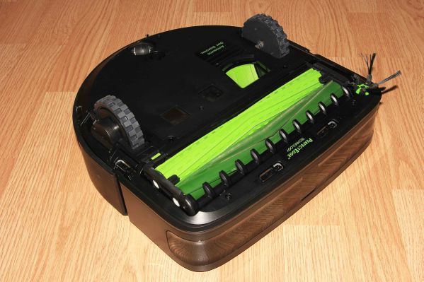 Основной вклад в качество уборки вносит турбощетка, состоящая из двух резиновых валков, вращающихся навстречу друг другу: один, сгребает мусор ближе, а другой отправляет его внутрь. Roomba s9+ эффективно справляется как с пылью, так и более крупными частицами, вроде деталей LEGO. Акустический сенсор, анализирует степень загрязнения, и, при необходимости, заставляет робота тщательнее обрабатывать поверхность. С боку находится вращающаяся щетка с 5 кисточками, которая выгребает мусор из углов.