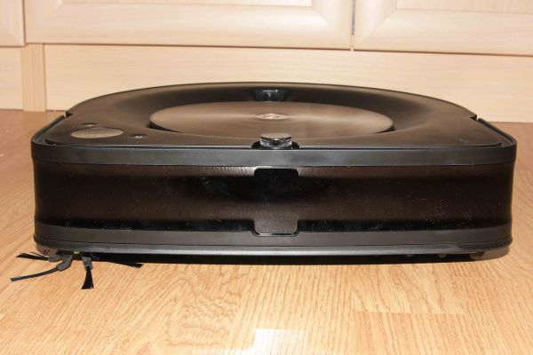 Спереди, на плоскую часть установлен подпружиненный бампер, предотвращающий повреждение мебели при столкновении, сзади расположены отверстия для выхода воздуха. В центре находится круглая крышка, под которой установлен пылесборник объемом 400 мл. На уборку одну уборку квартиры этого хватит с запасом, а затем мусор переместится в базу.