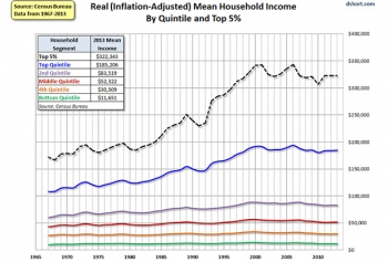 Точно так же не заметно больших успехов в росте доходов населения. А тот рост, что все-таки наблюдается, уходит в основном в карманы самых богатых — 20 процентов — американцев (и даже в рамках этих 20 процентов распределяется крайне неравномерно), тогда как основная масса граждан США особого увеличения благосостояния после кризиса не заметила, а по сравнению с докризисными временами и вовсе ощущает спад.