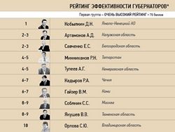 Если говорить о других позициях в группе, то по баллу потеряли главы Якутии Егор Борисов, Тамбовской области Олег Бетин, Республики Алтай Александр Бердников. Плюс один балл прибавили губернатор Оренбургской области Юрий Берг, Самарской области Николай Меркушкин, Ингушетии Юнус-Бек Евкуров, Забайкальского края Константин Ильковский.