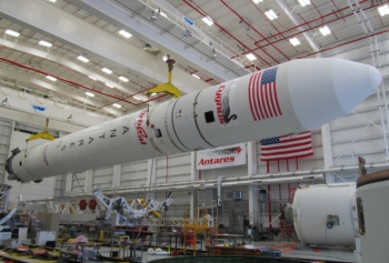 Ракета-носитель Antares в апреле 2013 года перед размещением на пусковом комплексе космодрома Уоллопс Фото: NASA